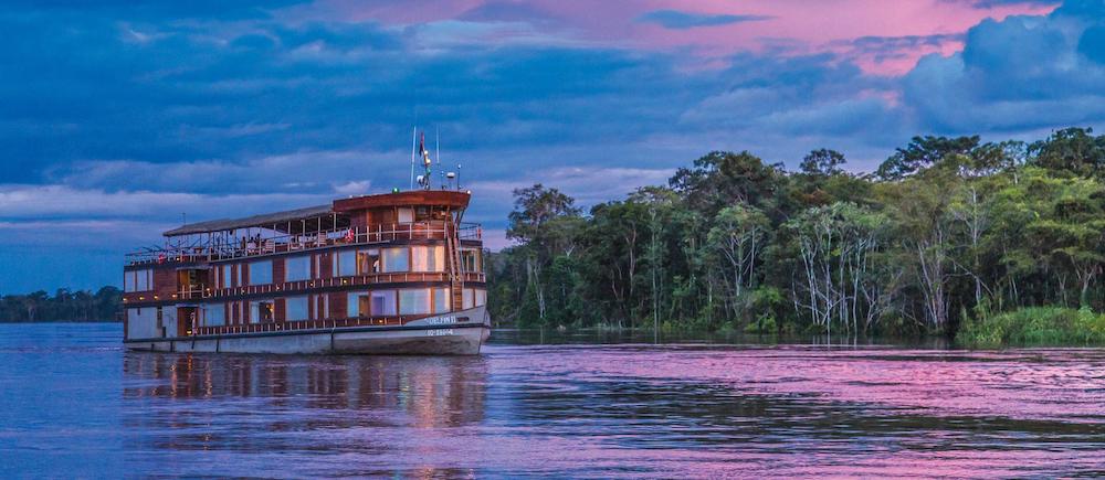 Navegue por los ríos Ucayali y Marañón hasta la confluencia del imponente Amazonas con estilo y comodidad a bordo del Delfín III . Cada una de las 21 espaciosas suites con aire acondicionado ofrece ventanales y vistas impresionantes. Explore los afluentes que alimentan estos ríos y observe la vida silvestre a bordo de una lancha con capacidad para 15 personas o un kayak, una forma tranquila de explorar arroyos remotos y poco visitados. Disfrute de las comodidades a bordo, que incluyen una sala de estar, una terraza al aire libre con jacuzzi, gimnasio y spa. Las comidas se preparan con maestría, con cocina sostenible y de origen local, en un comedor con capacidad individual para todos los huéspedes.